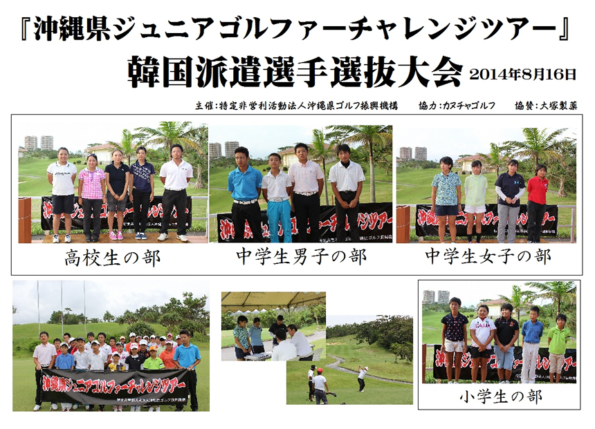 第2回沖縄県ジュニアゴルフファーチャレンジツアーは韓国で開催されるジュニアゴルフ大会への参加を予定しておりましたが、韓国におけるMERSの流行や韓国内の国際情勢の不安などの理由から今年は韓国への派遣を中止致しました。